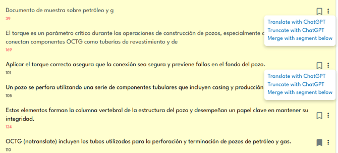 The “Translate with ChatGPT” option in the three-dot menu gives you AI-powered translation assistance at the segment level. It’s a smart, secure way to correct hallucinations and refine quality, all from within the File Editor.